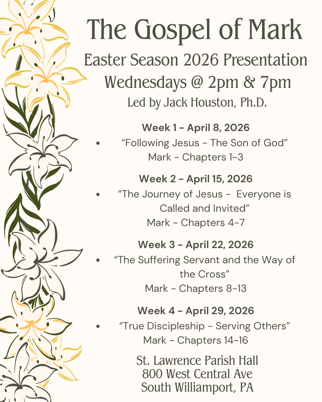 Saint Lawrence Hall This Easter season, travel through the first and shortest of the Gospels with Jack Houston as he explores its unique portrayal of Jesus as the “Powerful Servant” and reflects on its relevance to modern life. April 8: “Following Jesus – The Son of God” Mark 1-3